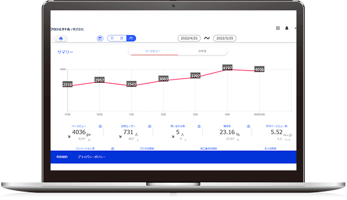 ホームページの制作、施工事例や求人情報の投稿、アクセス解析、問い合わせユーザーの管理などの建設業のマーケティングをこれ1つで成果へ導くことができます。